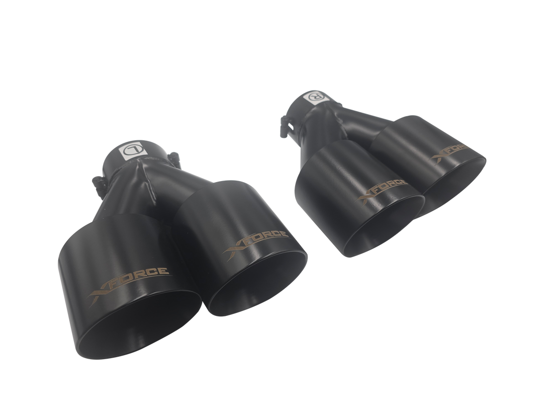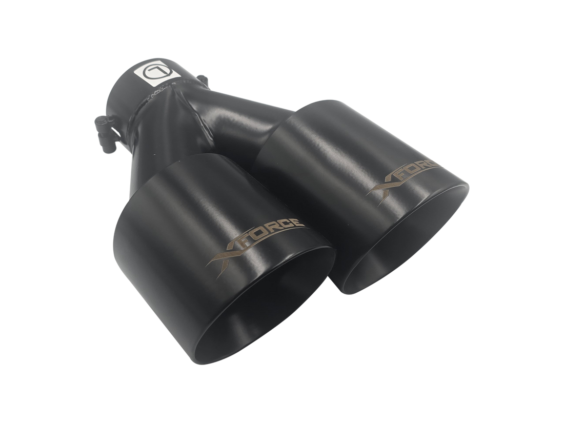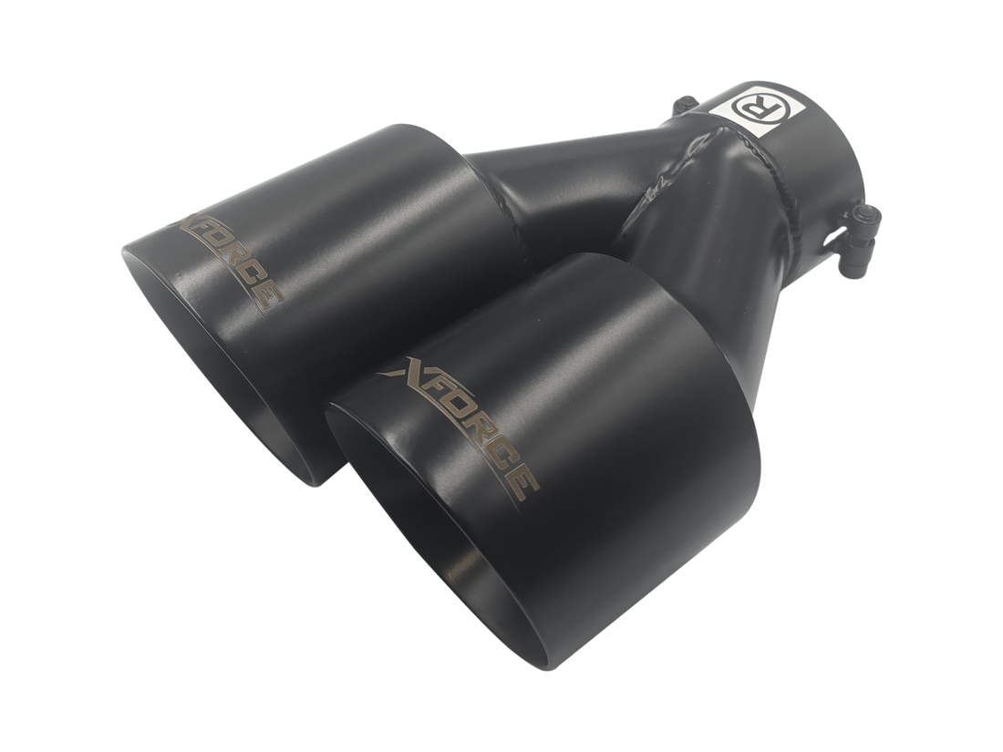 Twin 4" round angle cut dual wall tip Stainless steel Matte black coating 2.25" inlet...